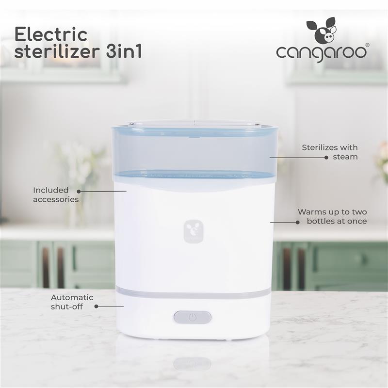 Този многофункционален електрически стерилизатор 3 в 1 от Cangaroo осигурява пълна грижа за бебешките шишета и аксесоари. Подходящ е както за стерилизация, така и за затопляне и приготвяне на храна на пара. Разполага с голяма вместимост, удобни кошнички и лесно управление, което го прави идеален помощник в ежедневието на всеки родител.