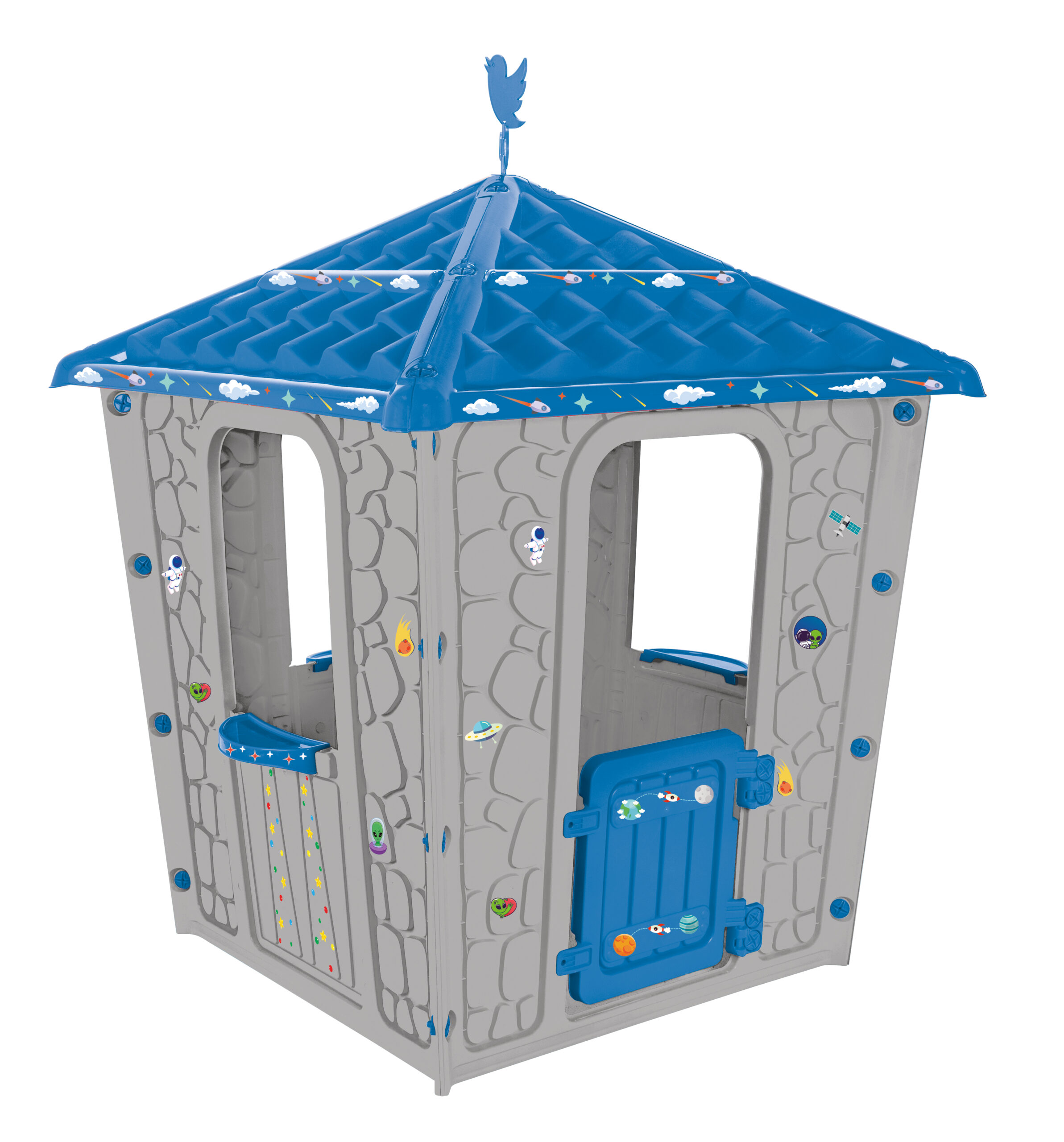 Детска пластмасова къща с имитация на камък е идеална за игра на повече от едно дете.