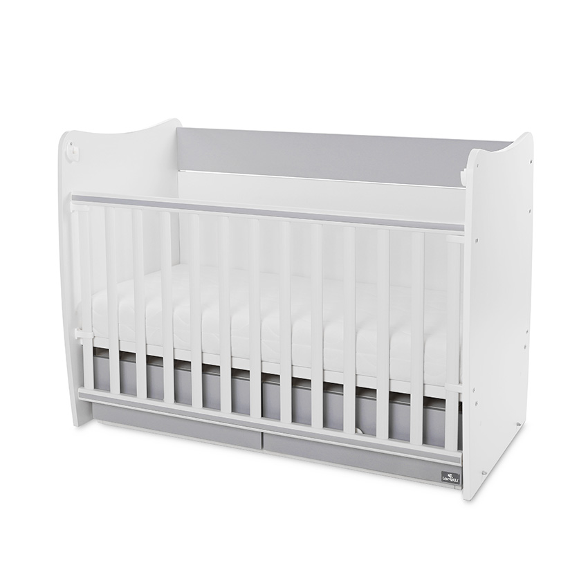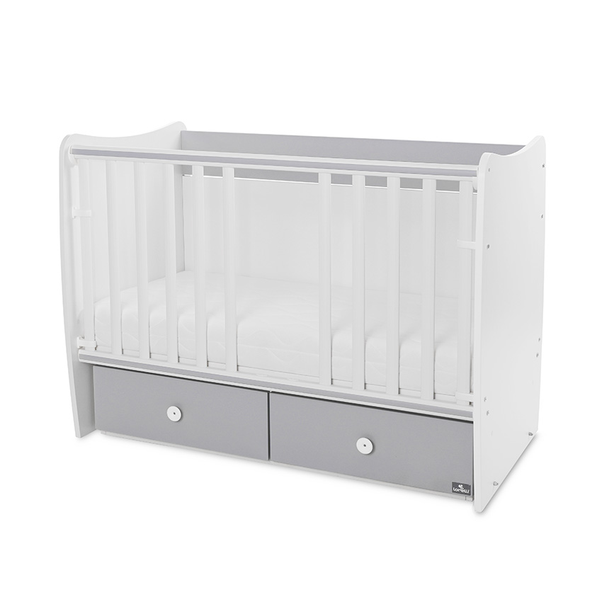2 нива на подматрачната рамка,2 големи чекмеджета,стабилно застопоряване на люлката,трансформира се в детско легло,бебешко легло-люлка,Произведено от ламинирано ПДЧ 18 мм от най-висок клас,размери,Предназначено за матрак 120x60x12 см (матракът не е включен в комплекта),PVC асансьорна решетка с две нива с автоматично застопоряване в горно и в долно положение, и неподвижна (стационарна) решетка,Отстраняеми предни ламели///