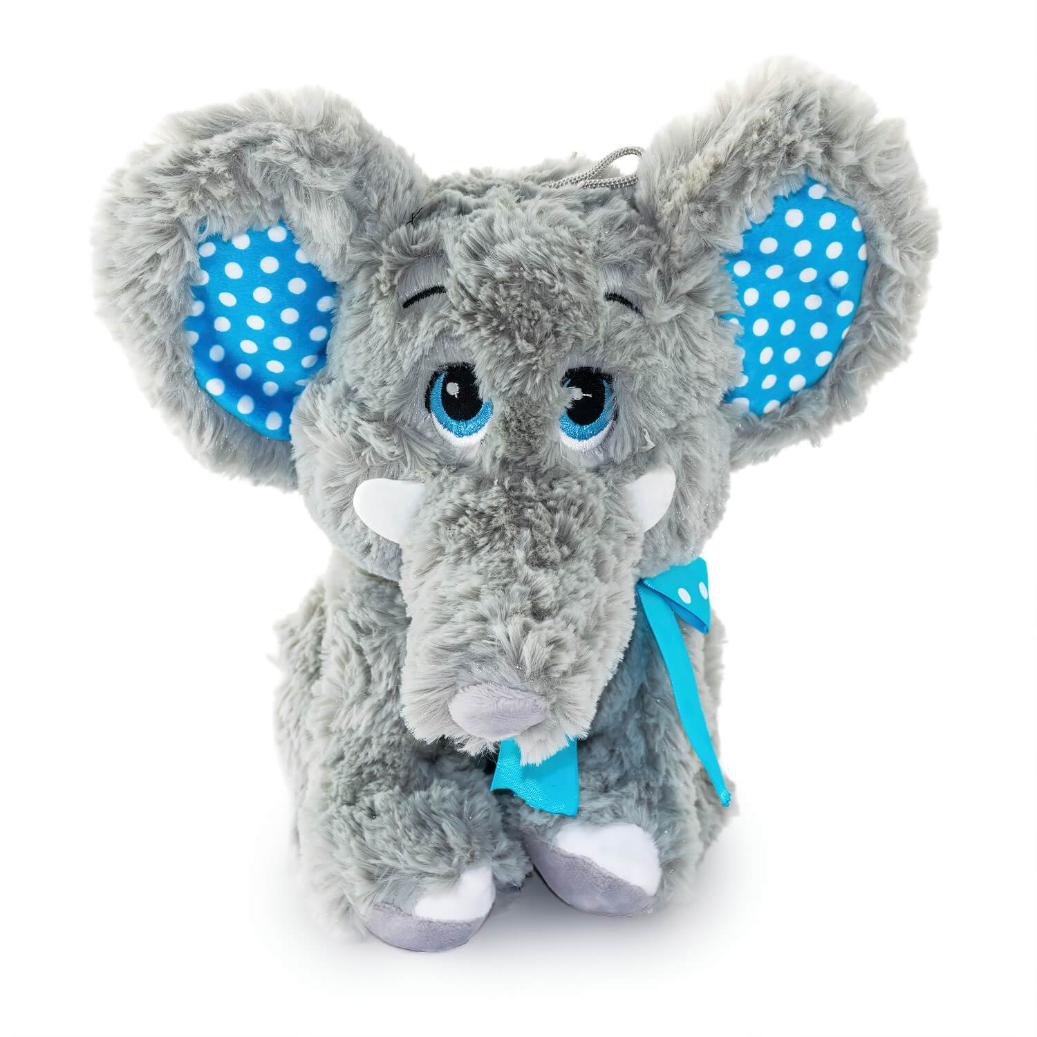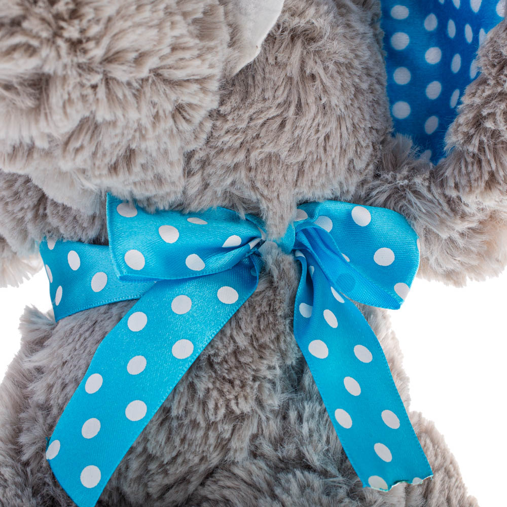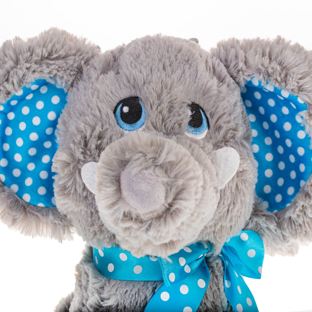 Плюшено слонче Слави има синя панделка.