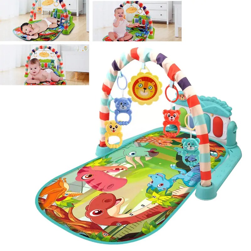 Комплекта съдържа мобилни пластмасови дрънкалки и пиано, което детето рита с крачета и активира мелодиите.