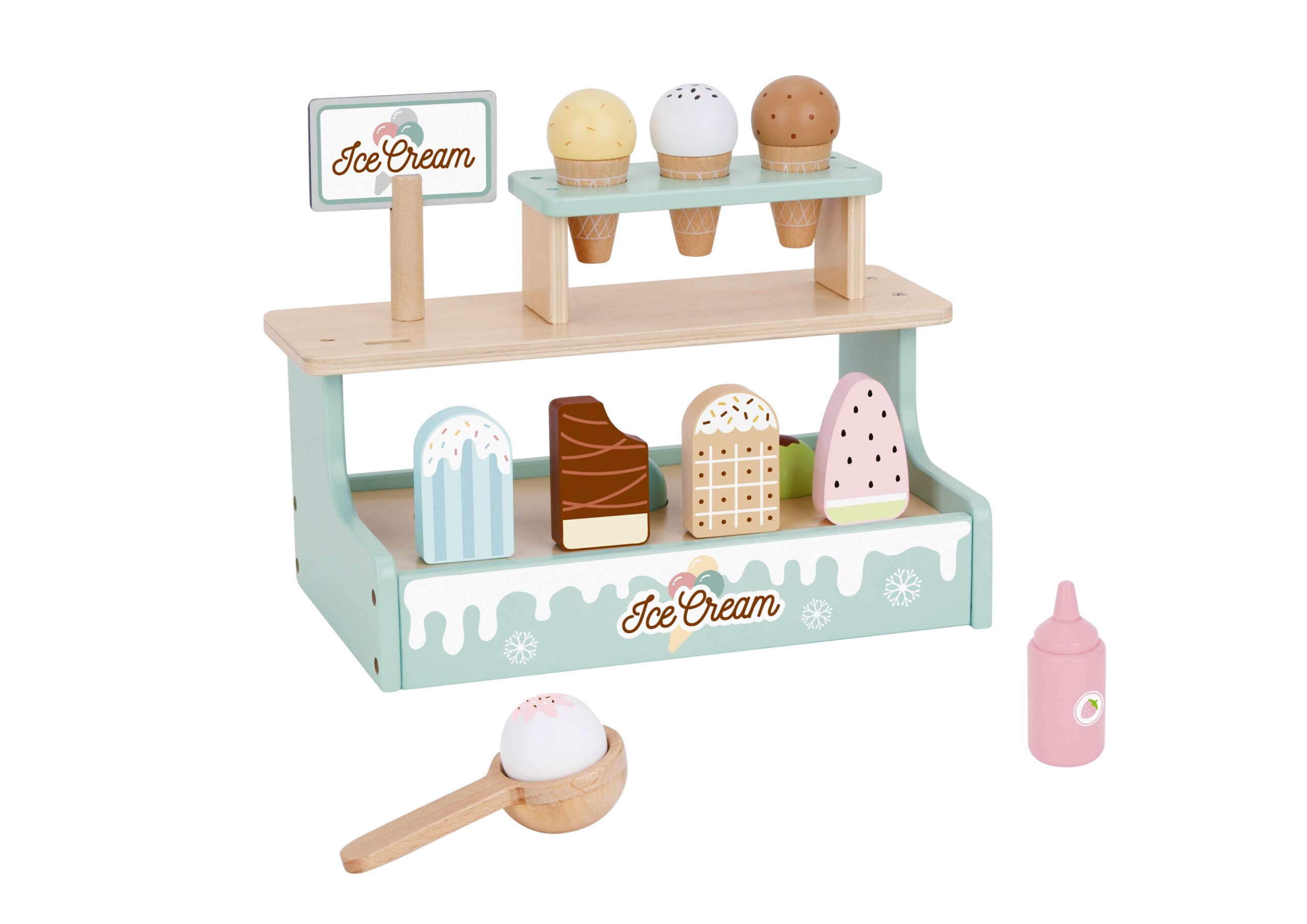 Комплектът включва 16 елемента: 1 щанд за сладолед,1 меню,1 лъжица за сладолед, 3 вафлени фунийки, 6 топки сладолед, 4 сладоледа на клечка, 1 топинг.