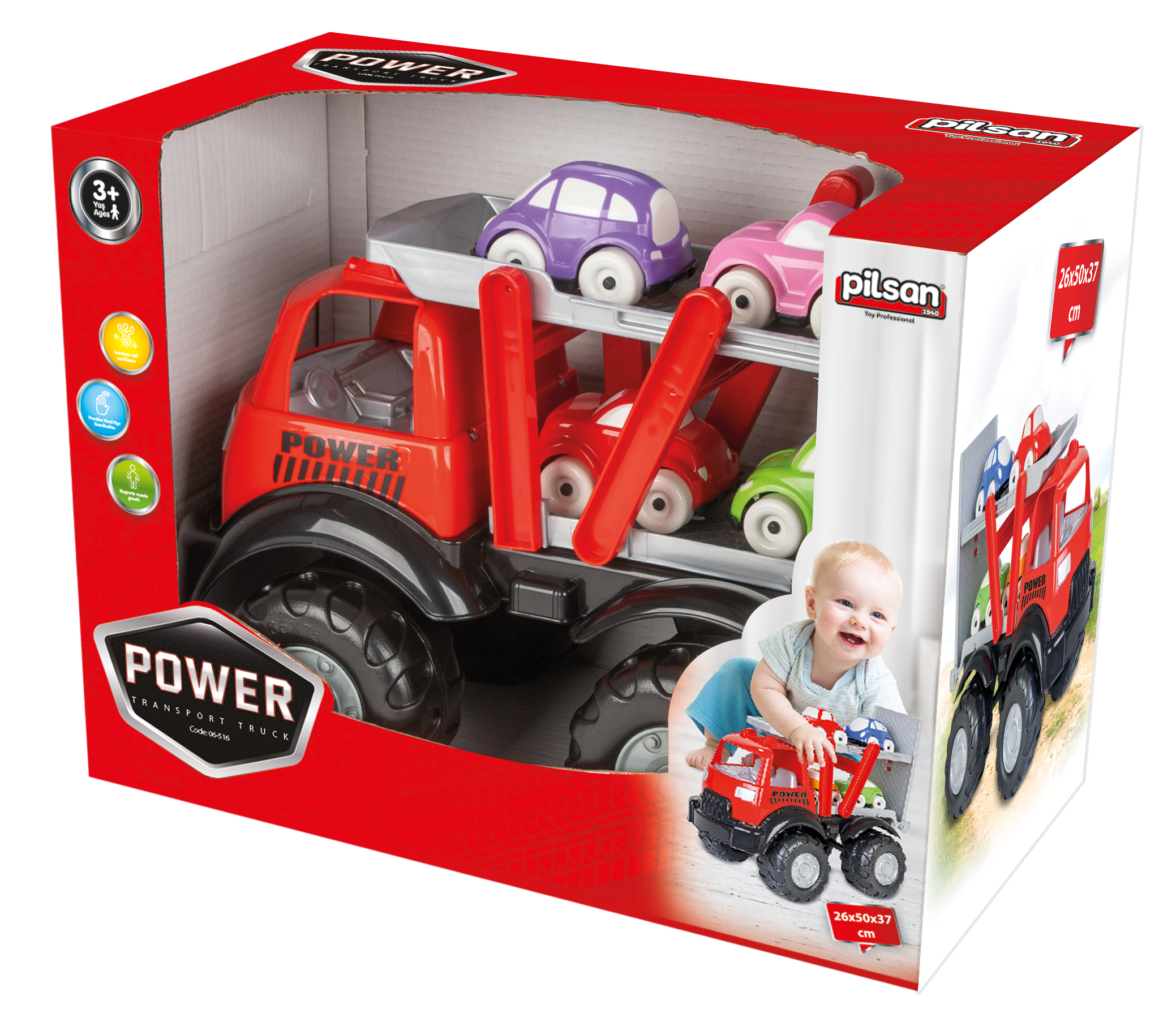 Комплектът се състои от 1 голям камион и 4 по-малки коли в различни цветове.
