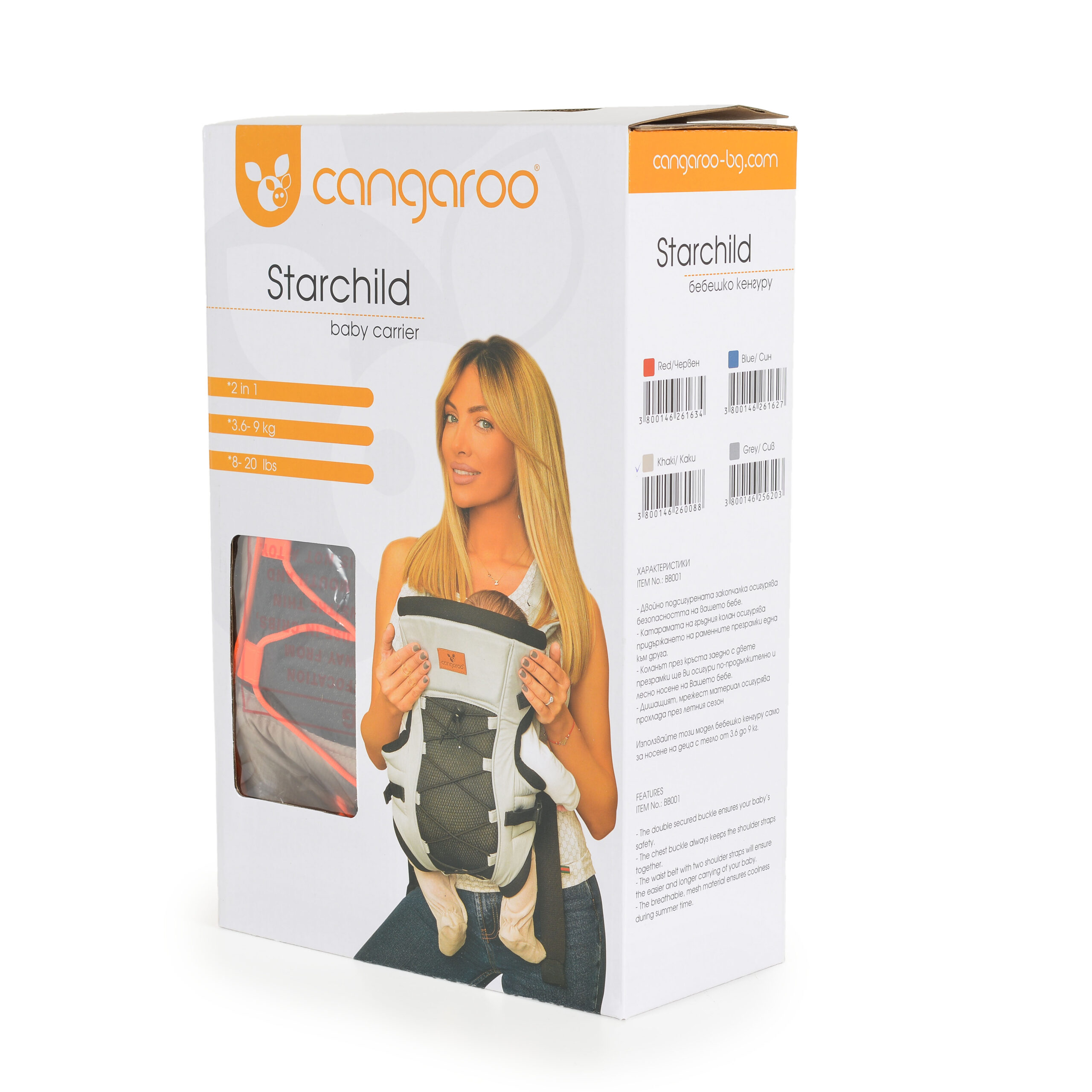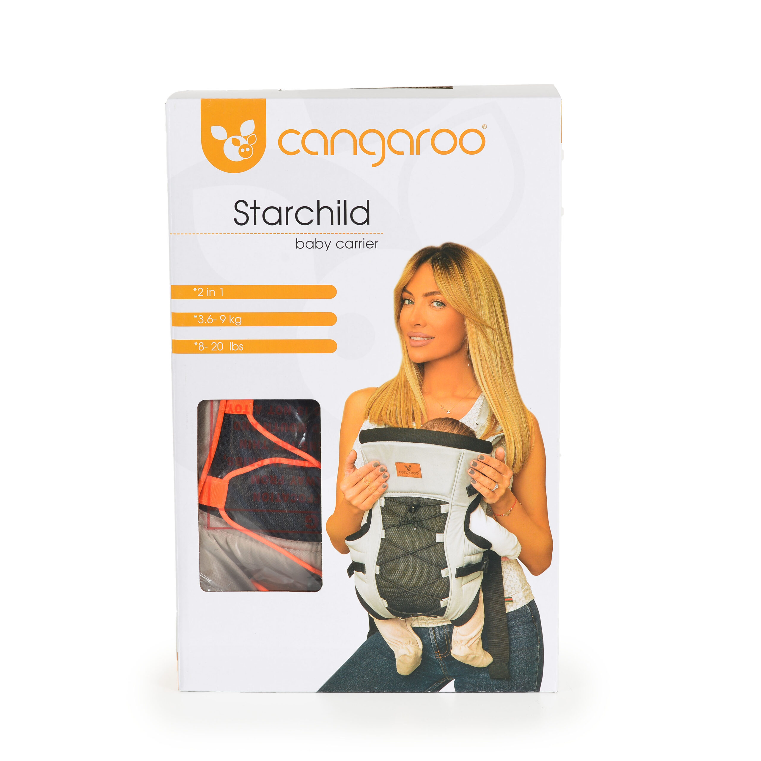 Кенгуруто “Starchild“ подходящо за деца с тегло от 3.60 до 9 кг. Детето може да се носи с лице към родителя (до 6 месечна възраст) и навън с лице към движението.