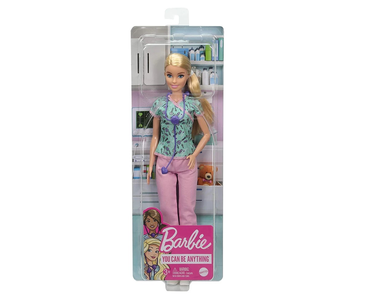 Опознайте света на медицинските сестри с куклата Barbie® медицинска сестра! Когато едно момиче играе с Barbie®, тя си представя всичко, в което може да се превърне, и ако обичате да се грижете за хората и да им помагате, значи може да бъдете медицинска сестра! Куклата Barbie® медицинска сестра (30,40 cm) е облечена с медицинска униформа, която се състои от горна дреха на принт с медицински принадлежности и розови панталони, бели обувки и хваната в небрежна опашка коса. Куклата се предлага със стетоскоп, който виси на врата й. Децата ще се влюбят в безкрайните възможности за игри, изпълнени с креативност и забава. Куклата не може да стои изправена сама. Цветовете и декорациите може да се различават. Това е един чудесен подарък за деца на 3 или повече години.