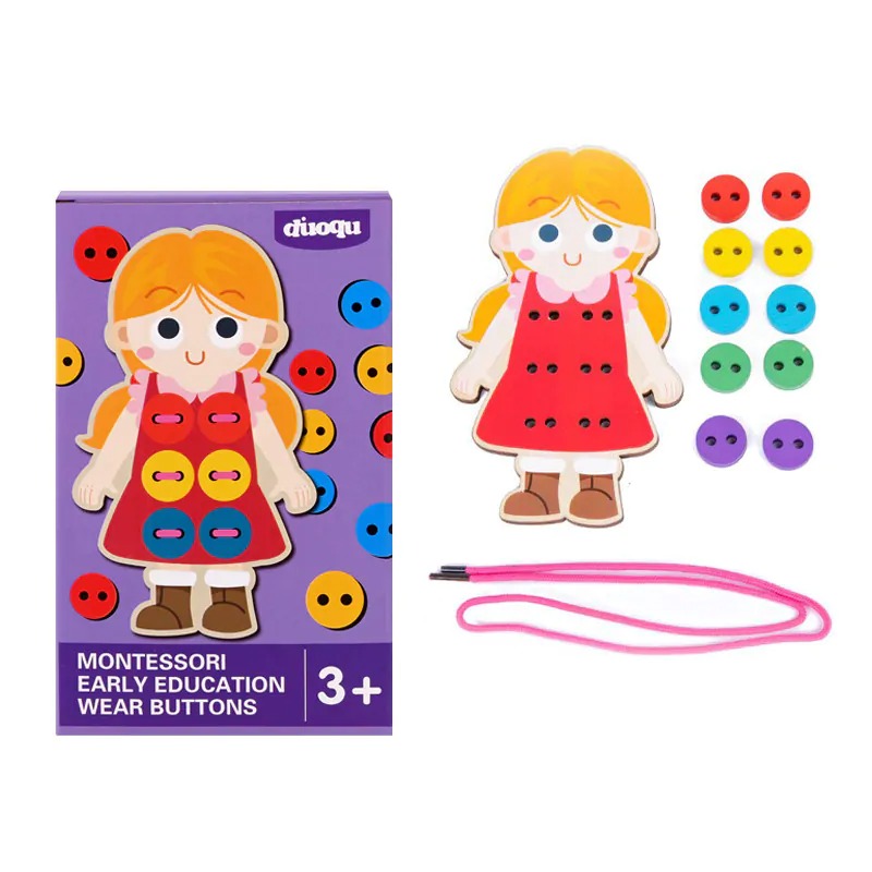 Дървена образователна играчка тип Монтесори за връзки и нанизване, стимулира фината моторика на малчуганите, логическото им мислене, но също така тяхното търпение, постоянство и сръчност. Те трябва да прокарат връзката през дупките на копчетата и фигурата, това може да постави на изпитание упоритостта им.