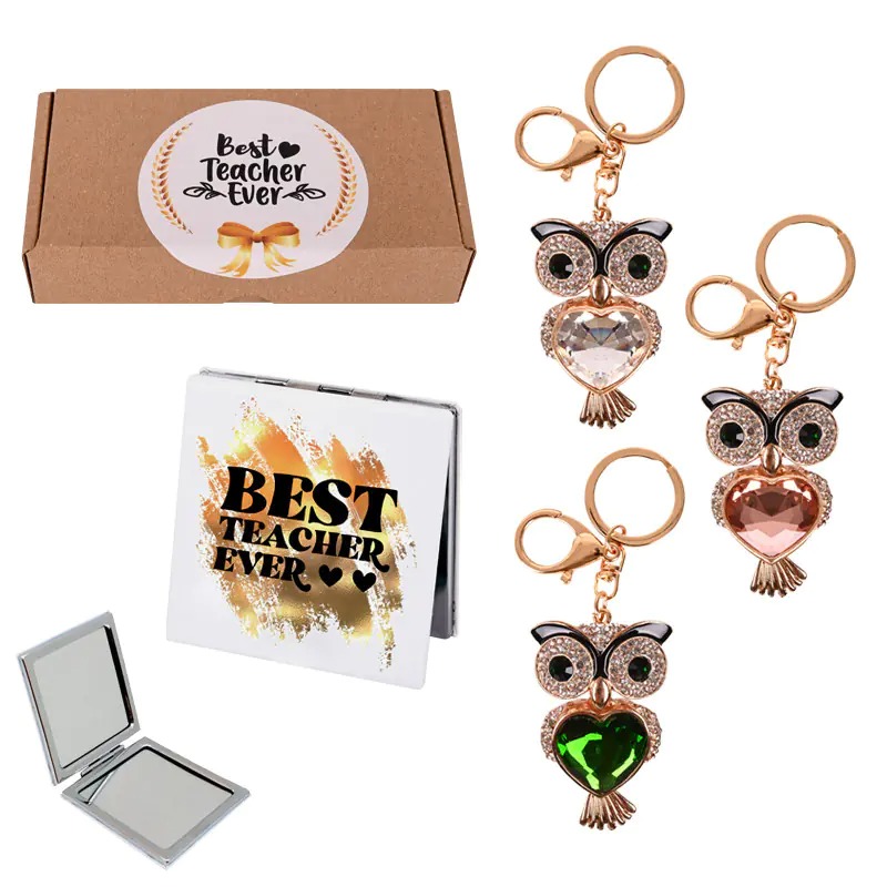 Подаръчен комплект „Best Teacher“ с огледало и метален ключодържател бухал.