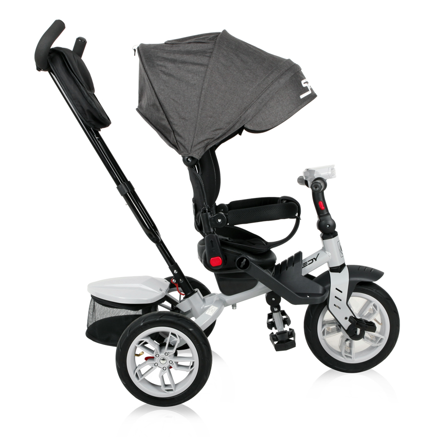 позиция: с гръб към родителя,позиция: с лице към родителя,позиция: родителски контрол,триколка,регулируема и комфортна облегалка,сгъваем сенник с 2 секции, прозорче с капак и козирка с възможност за сваляне посредством цип,преден панел – фар с музика и светлина,чанта,подвижен гриф с бутон за закопчаване,сгъваема поставка за крачета,бутон за стопиране движението на педалите на предното колело,текстилен багажник с пластмасов капак,подвижна поставка за крачета за по-малки деца,бутон за регулация на кормилото,бутон за завъртане на седалката – ротация на 360º,индивидуални спирачки на задните колела,3-точкови предпазни колани,2 степени на регулация на родителската дръжка,отстраняема тапицерия за лесно почистване,въздушни гуми – 12 и 10 инча,дъждобран за триколка /не е включен//
