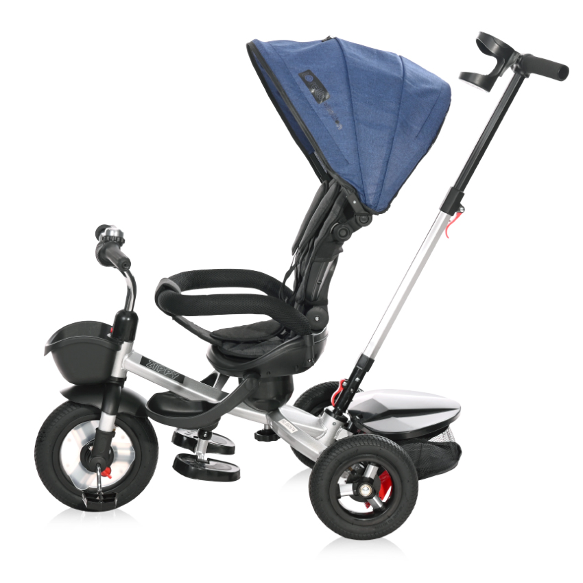 2 позиции за монтаж на седалката,звънец,регулируема и комфортна облегалка,Отстраняем гриф,сгъваема поставка за крачета,позиция: с гръб към родителя,позиция: родителски контрол,триколка,пластмасова поставка за чаша или шише,предпазни колани,Индивидуални спирачки на задните колела,2 позиции за регулация на височината на дръжката за родителски контрол,текстилен багажник с пластмасов капак,бутон „свободно кормило“,сгъваем сенник с допълнителна мрежеста секция,поставка за крачета за по-малки деца,пластмасова поставка,функция „свободно движение“,въздушни гуми за безопасна и комфортна употреба,дъждобран за триколка /не е включен//